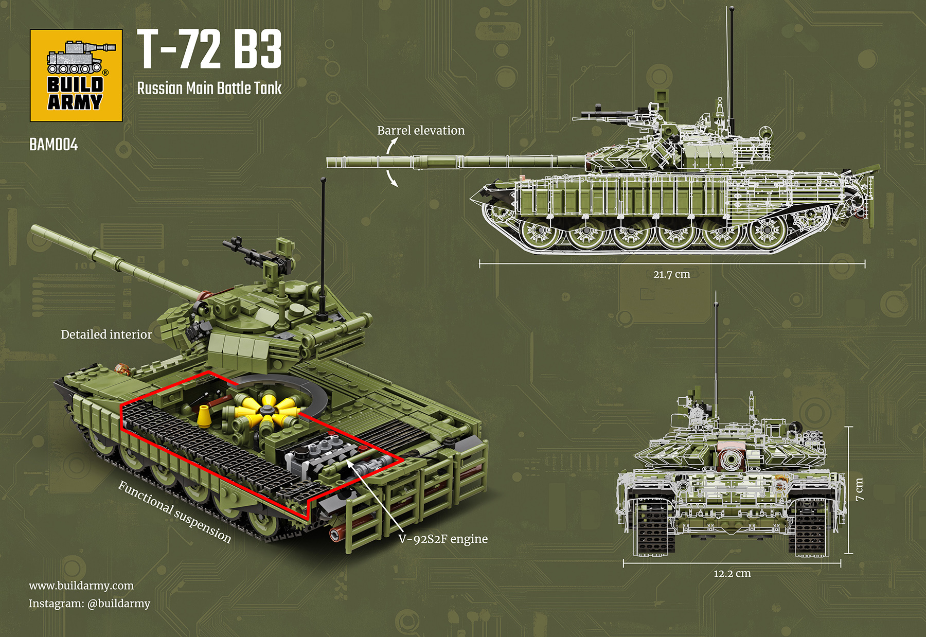 Build the powerful Russian T-72B3 main battle tank, a modernised version of one of the world’s most iconic tanks, widely used by many nations due to its proven reliability, ease of maintenance, and affordability.