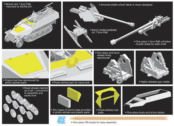 Dragon’s new 1/72 kit is based on the existing high-quality Sd.Kfz.251 chassis, with all the necessary alterations enabling it to mount the 7.5cm cannon.