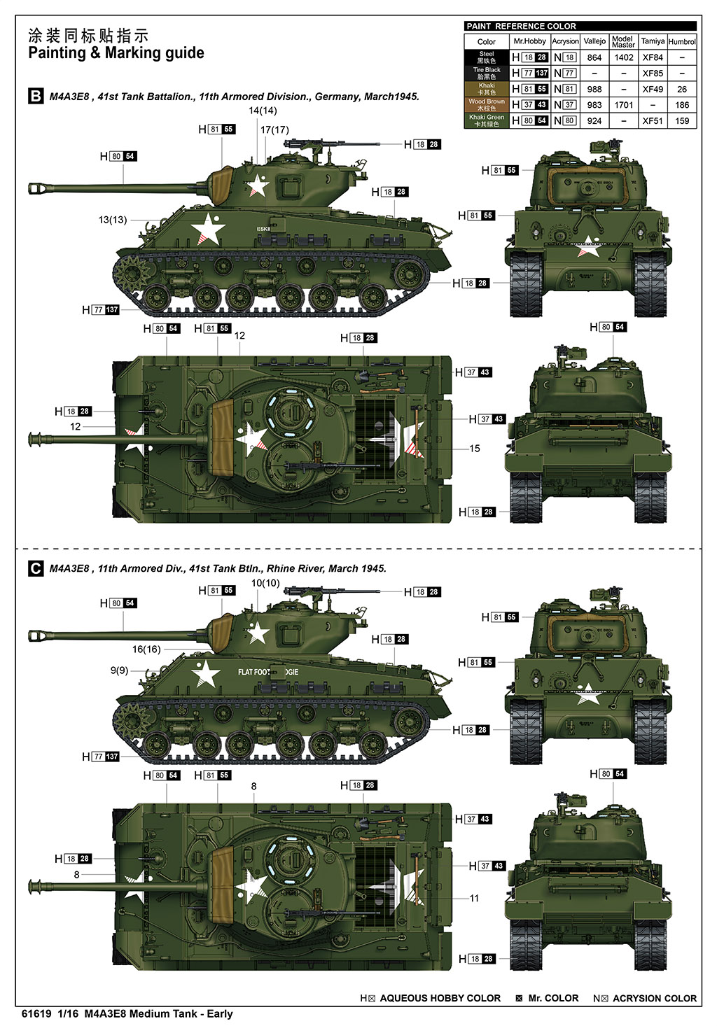 -Choice of 3 markings: (1) Unknown unit, Germany March 1945; (2) 41st Tank Battalion, 11th Armored Div "Eskimo", Germany March 1945; (3) 41st Tank Battalion, 11th Armored Div "Flat Foot Floogie", first to reach the Rhine River, March 1945.
