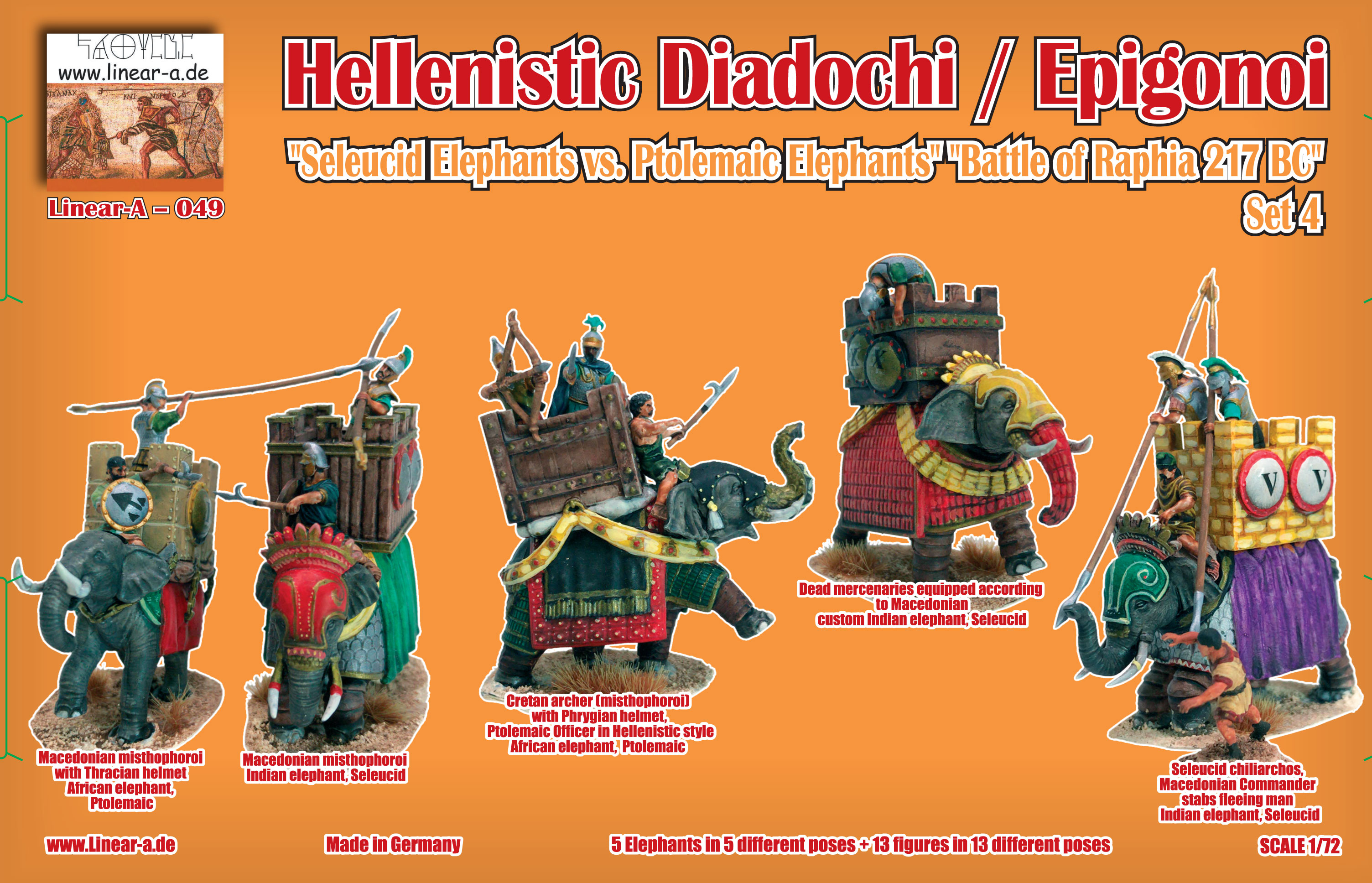 | Short Description | Linear-A 1/72 Hellenistic Diadochi / Epigonoi - Seleucid ELEPHANTS versus Ptolemaic ELEPHANTS Set 4 "Battle of Raphia 217 BC" BIG SET) # 049 |