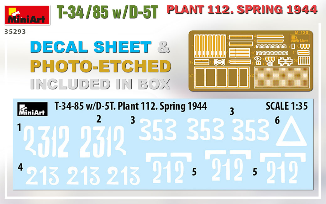 | Short Description | Miniart 1/35 T-34/85 w/D-5T Plant 112 1944 # 35293 |