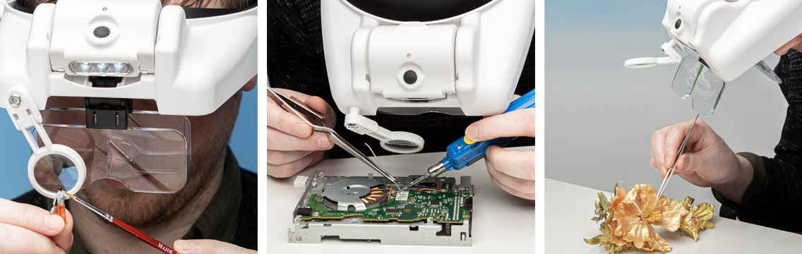 Versatile headband magnifier ideal for precision tasks and detail work. The three lenses can be used in different combinations to give a range of 1.0- 13.0x magnification. Features built-in LED spotlight for further accuracy.