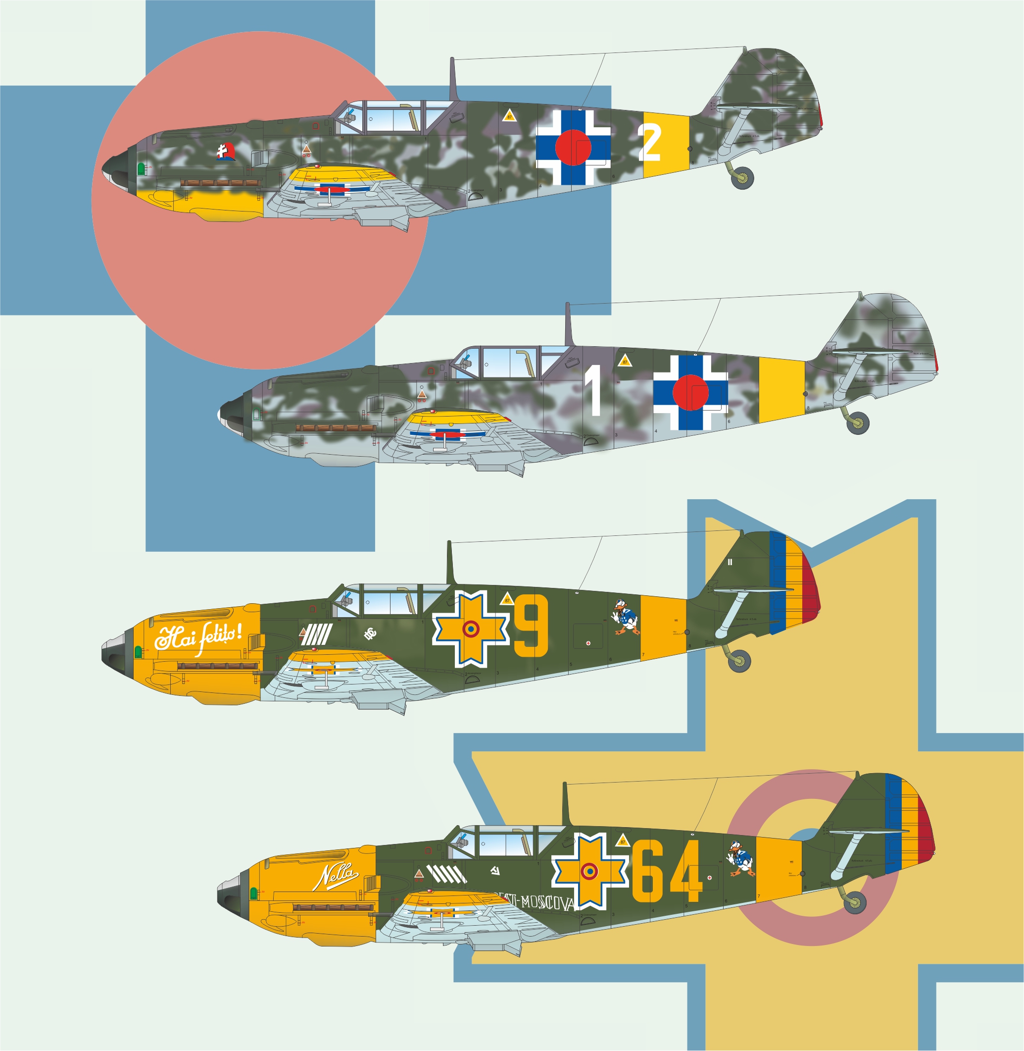 The top-notch model of the Messerstchmitt Bf 109E is here in yet one more reboxing offering decals for two Slovak-born ace pilots and two from Rumania-and these latter ones are also those with most eye-catching machines in the box.