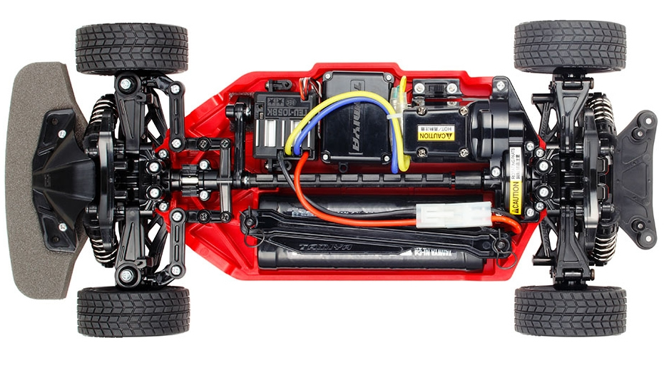 The shaft-driven 4WD TT-02 chassis employs a longitudinal layout with the battery on the left and the motor on the right, to give excellent stability. In addition, it features identical left and right suspension arms and uprights for ease of assembly, plus easy-to-maintain gearboxes. It is a highly adaptable chassis, as it offers 2 different wheelbases, 2 ground clearance settings and 2 tread set-ups in addition to a range of 10 possible gear ratios. It is not short on looks either, with brake disc-shaped wheel hubs and stylish front bumper supports. 10-spoke wheels are paired with tread-patterned racing radial tires.