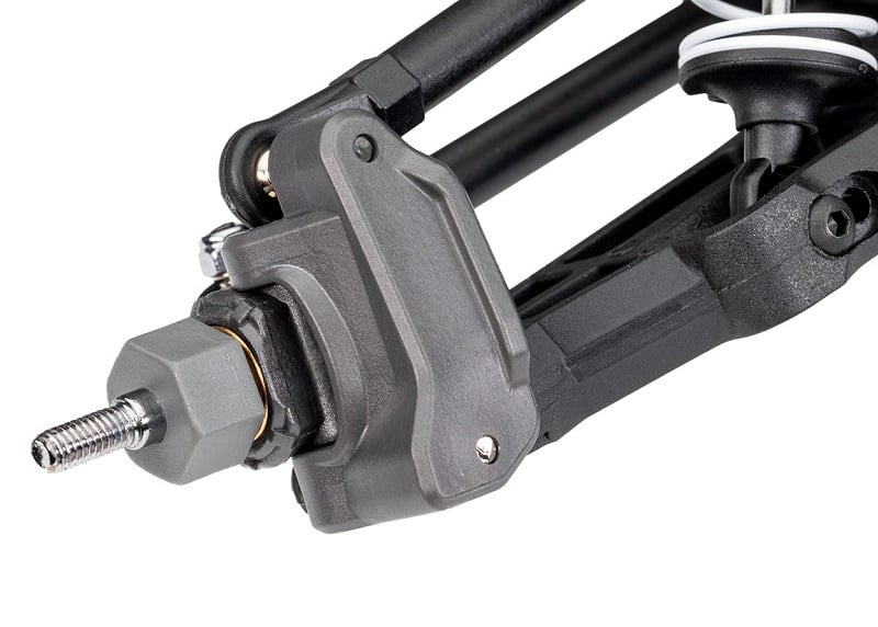 Rustler's clipless body holds firm no matter how rough the action gets. Heavy duty latches grip the body tightly, but release in just seconds for fast battery swaps. This convenient hidden latching system replaces traditional body clips with reinforced panels to maintain body integrity and resist pull-through damage.